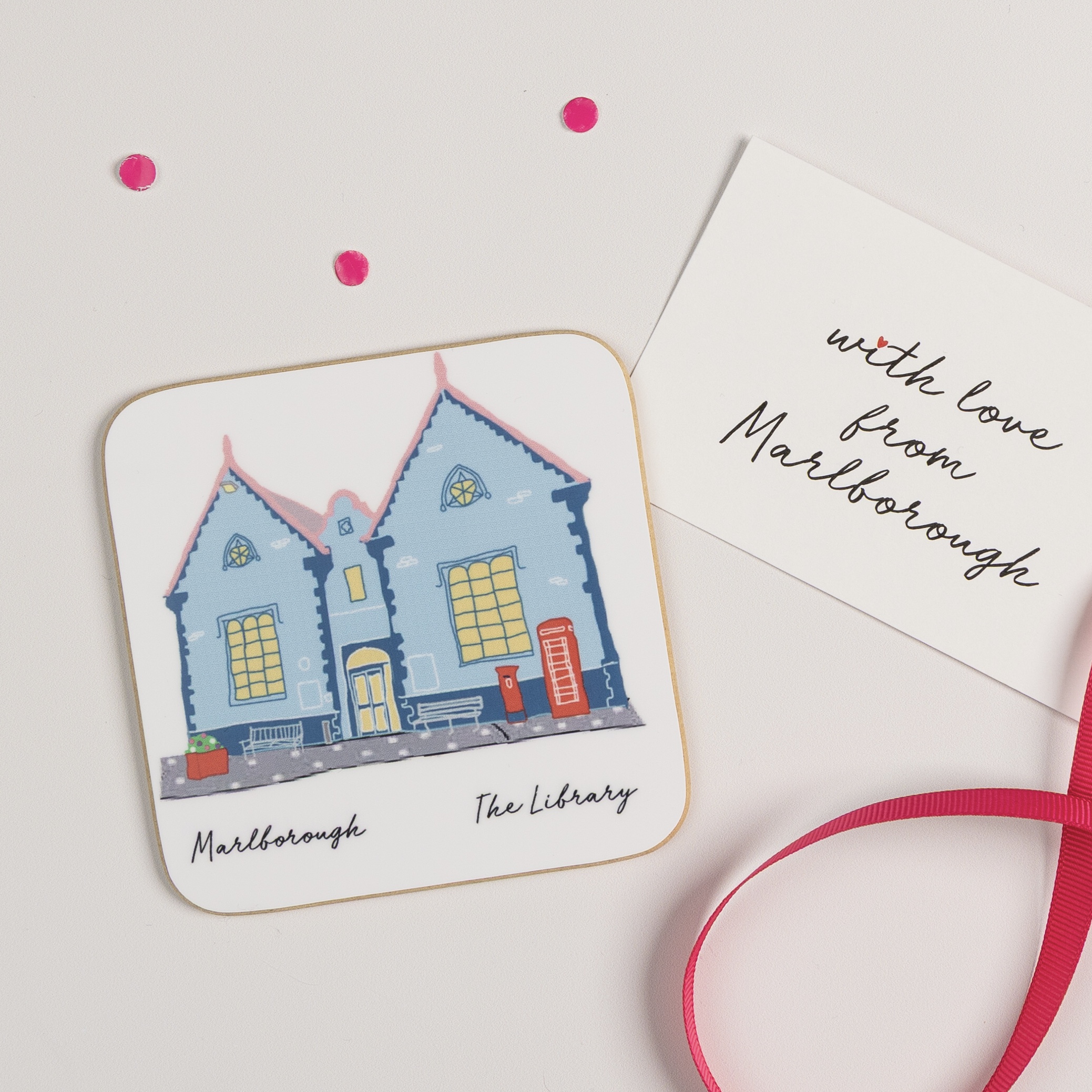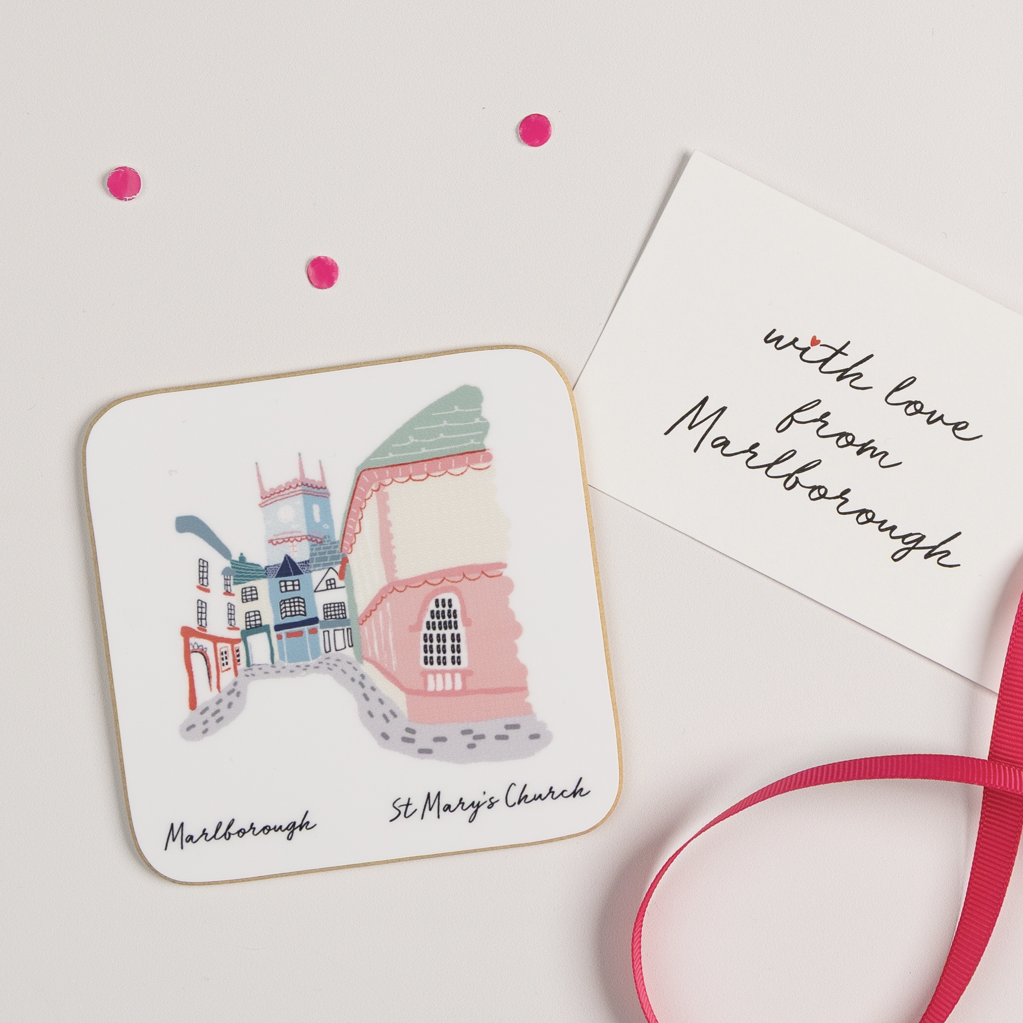 Pack of four illustrated coasters celebrating Marlborough Town Hall, St Mary’s Church, High Street and The Library